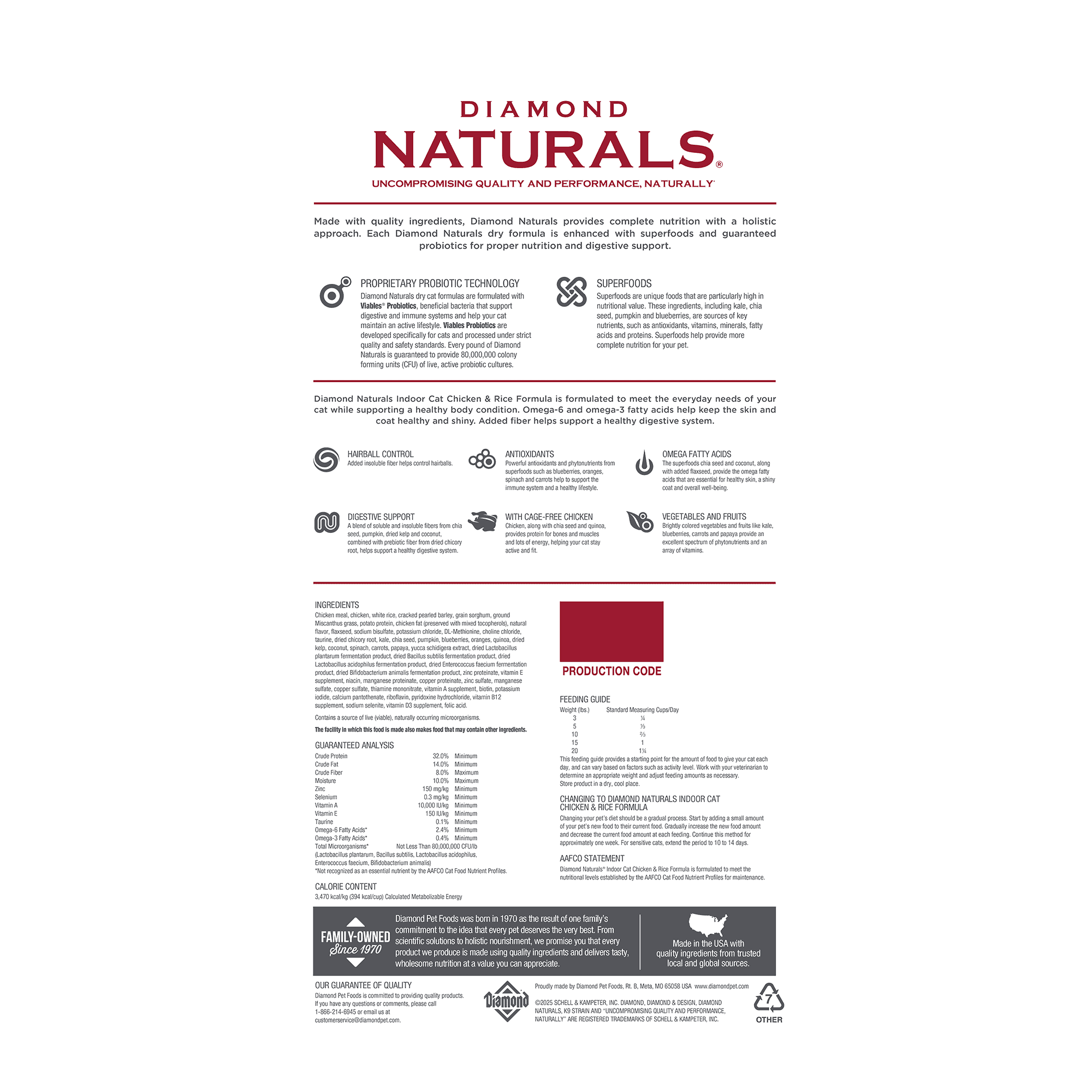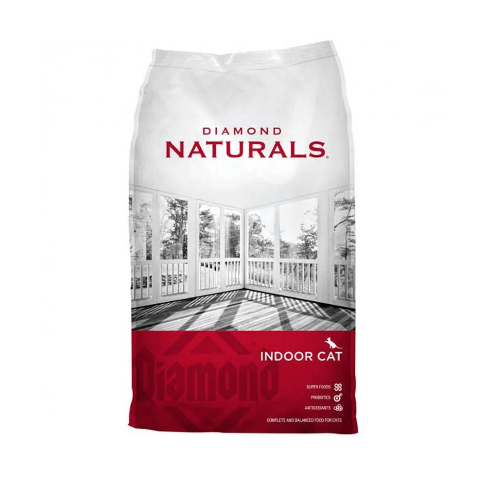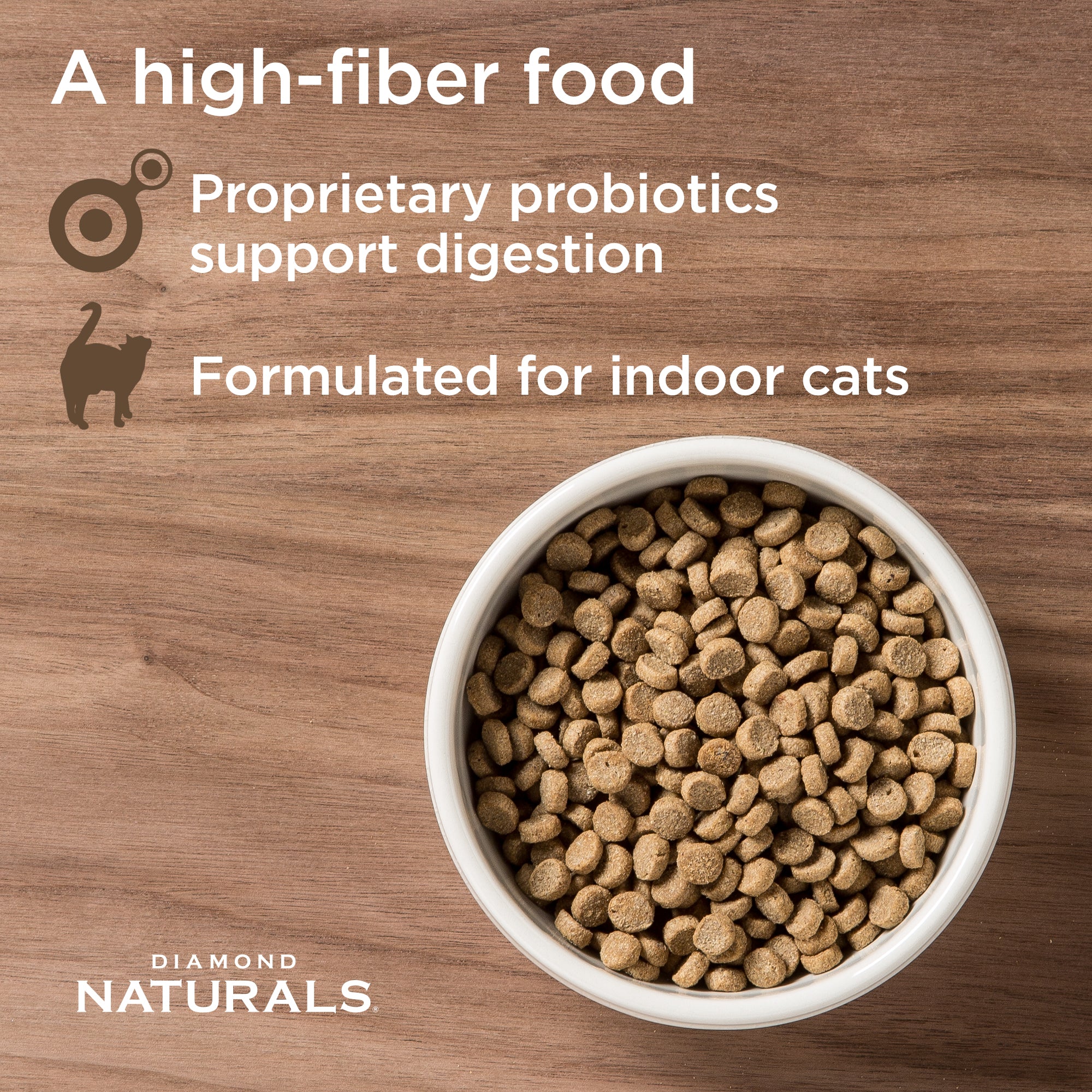 Alimento holístico para gatos de interior con pollo cage-free y fibra técnica.