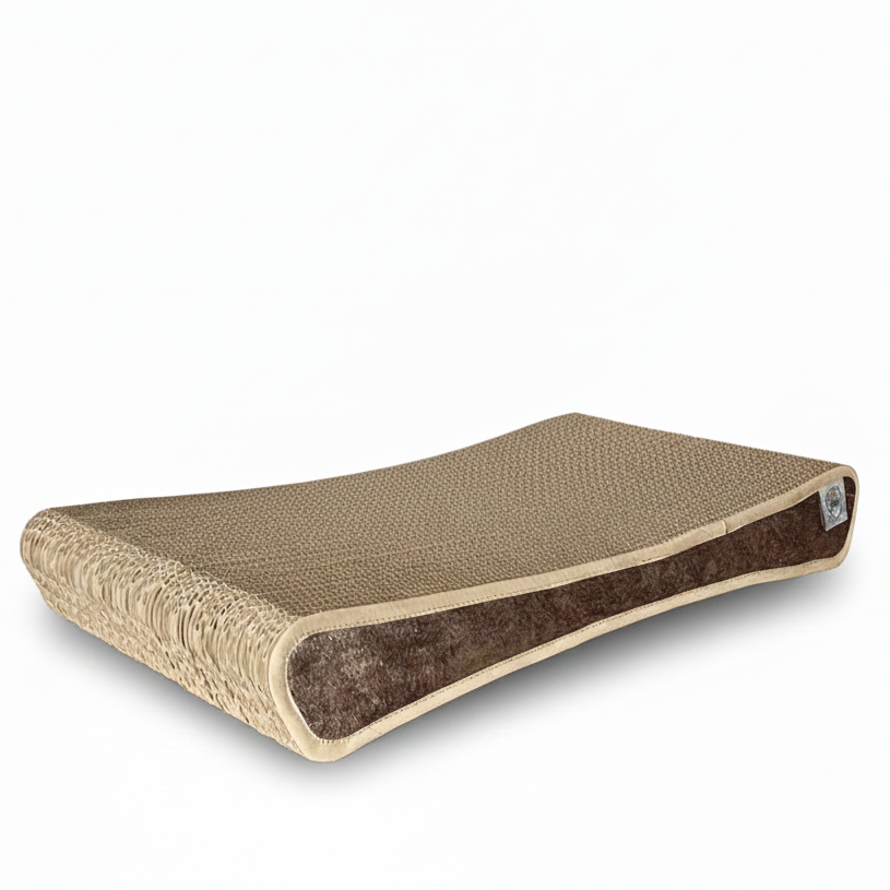 Rascador de plataforma curva en cartón corrugado doble pared. Ideal para espacios pequeños.